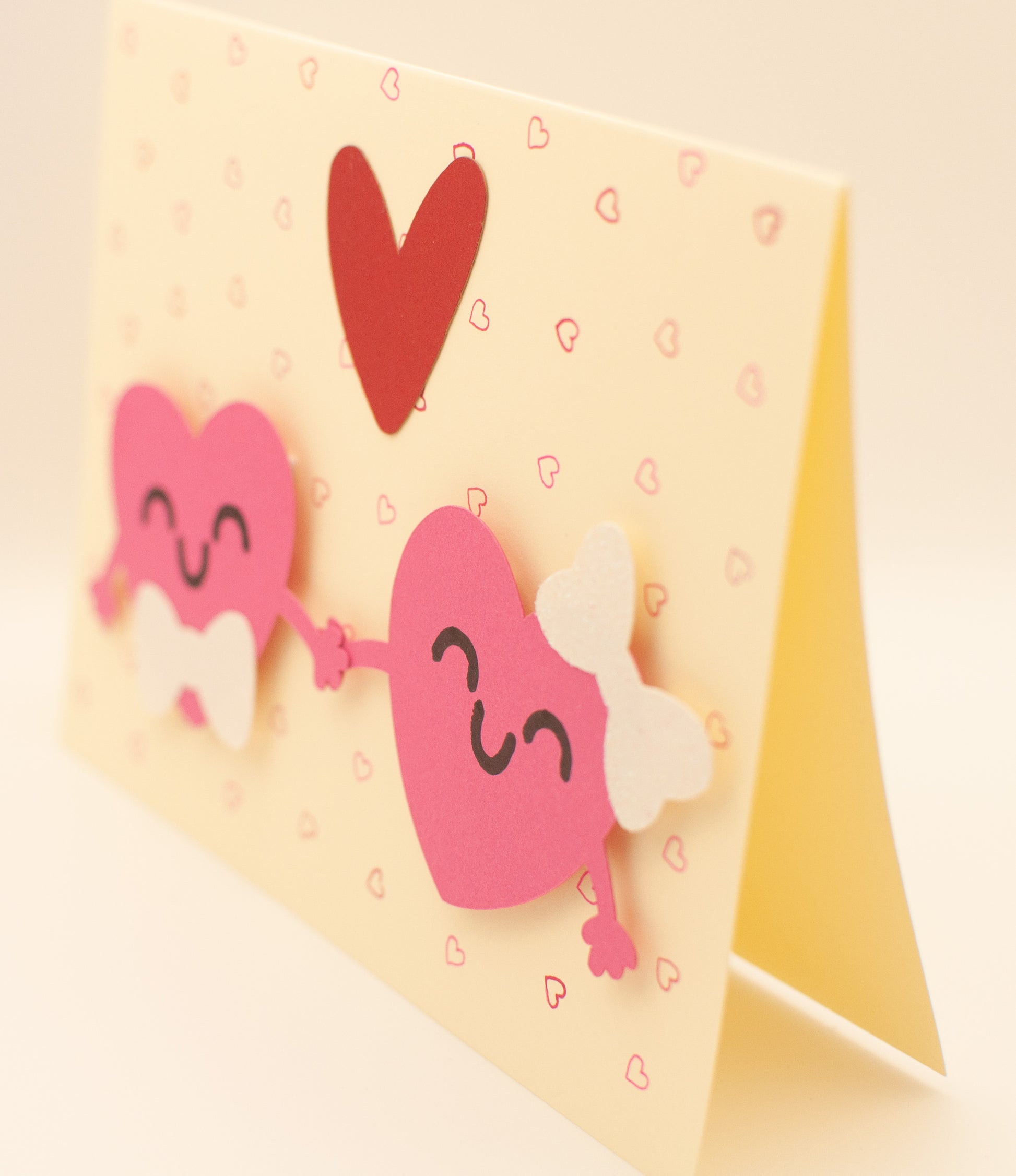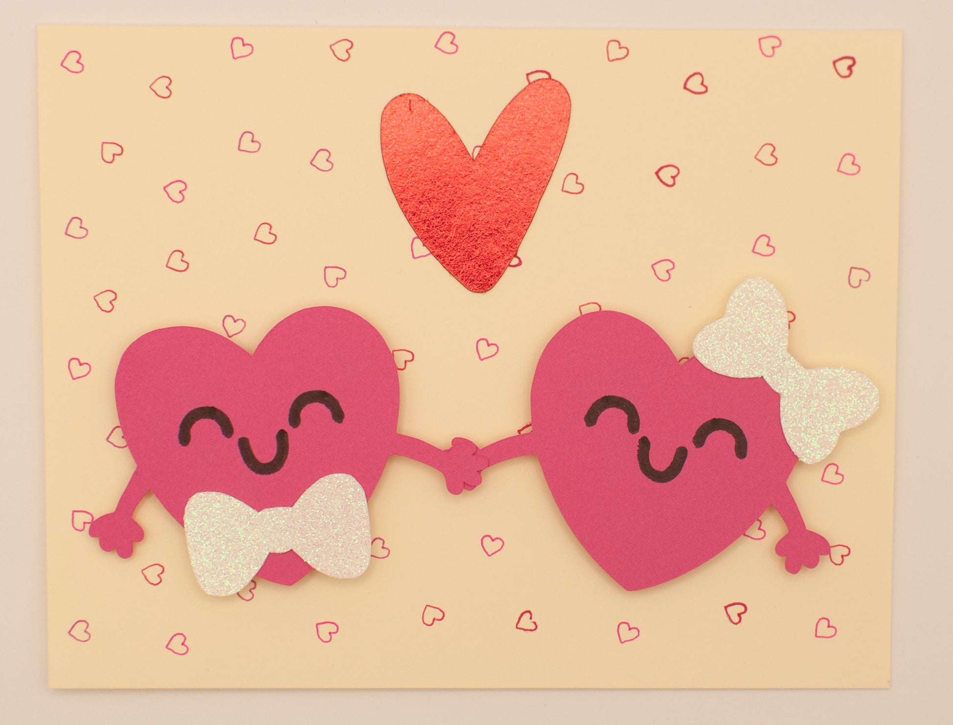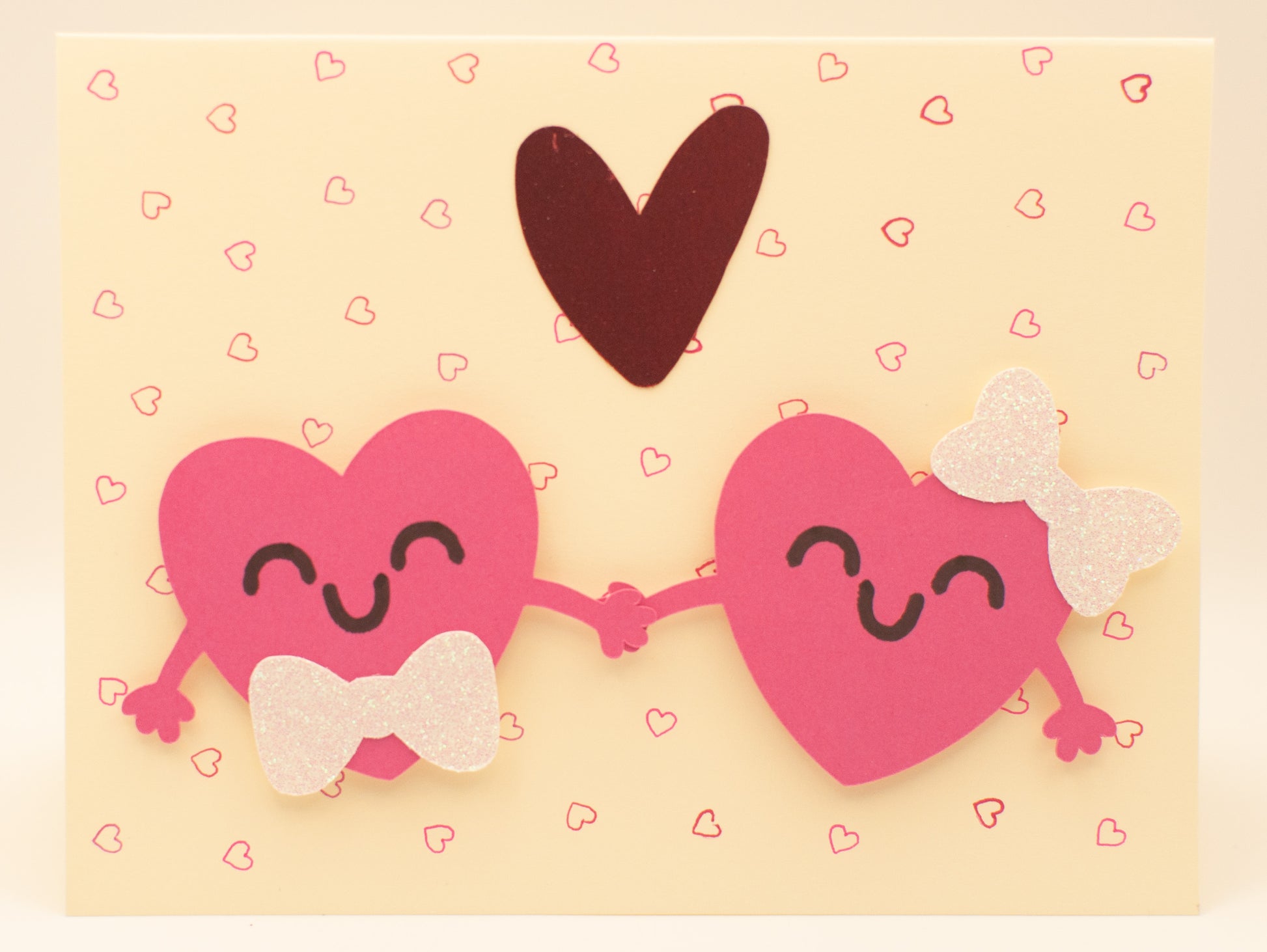 This handmade card features an adorable pair of smiling hearts holding hands, finished with sparkling bow details and a raised heart accent for extra charm. Each element is thoughtfully cut, layered, and assembled by hand, creating a sweet keepsake that feels just as special as the message inside.